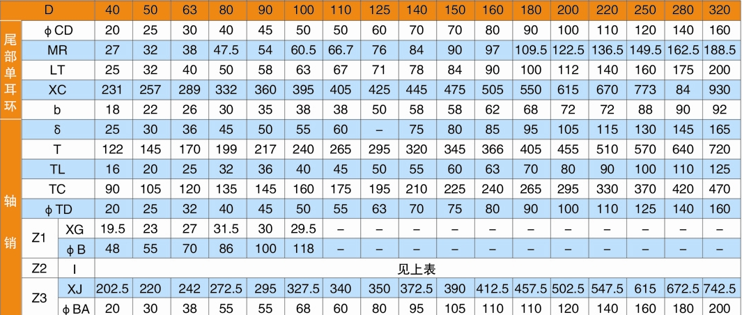 E1=尾部單耳環(huán)帶關(guān)節(jié)軸承;E2=尾部單耳環(huán)帶軸套;